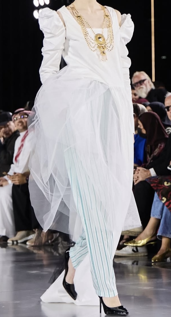 سروال “خط البلدة” يطل بخطوطه الدقيقة من بين الطبقات، في تحية مباشرة لملابس نساء نجد القديمة، كان في الماضي قطعة داخلية، رمز للخصوصية والستر، لكنها هنا تتحول إلى تفصيل بصري قوي، يُظهر كيف تتحول الذاكرة إلى موضة، وكيف يمكن للجذور أن تكون عصرية إذا أُعيدت بذكاء