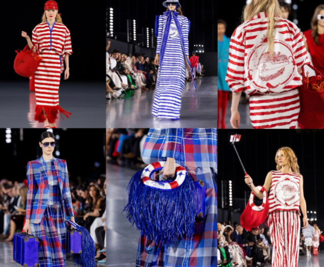 افتتح العرض على صوت بوق السفينة، حين ظهر القبطان ببدلة من قماش الميدراس يحمل بين يديه نموذجين للسفينة الفاخرة، كأنها قلب المجموعة النابض، الذي يحمل في تفاصيله روح البحر الأحمر وتراث أهل الساحل. الميدراس هنا ليست مجرد زي، بل رمز لفوطة أو وزرة الصيادين في ينبع والخليج، الذين لطالما ارتدوها بطريقة اللف المميز، مردّدين أناشيد البحر التي كانت توحّد الإيقاع وتخفف عناء الصيد.